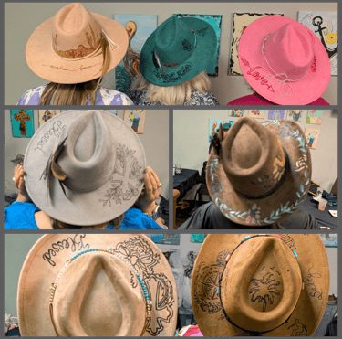 Add a one-of-a-kind western touch to your accessories in this creative, guided workshop! You’ll customize a vegan suede cowboy hat or baseball cap using hand-burned designs, with the option to add painted accents for extra flair.